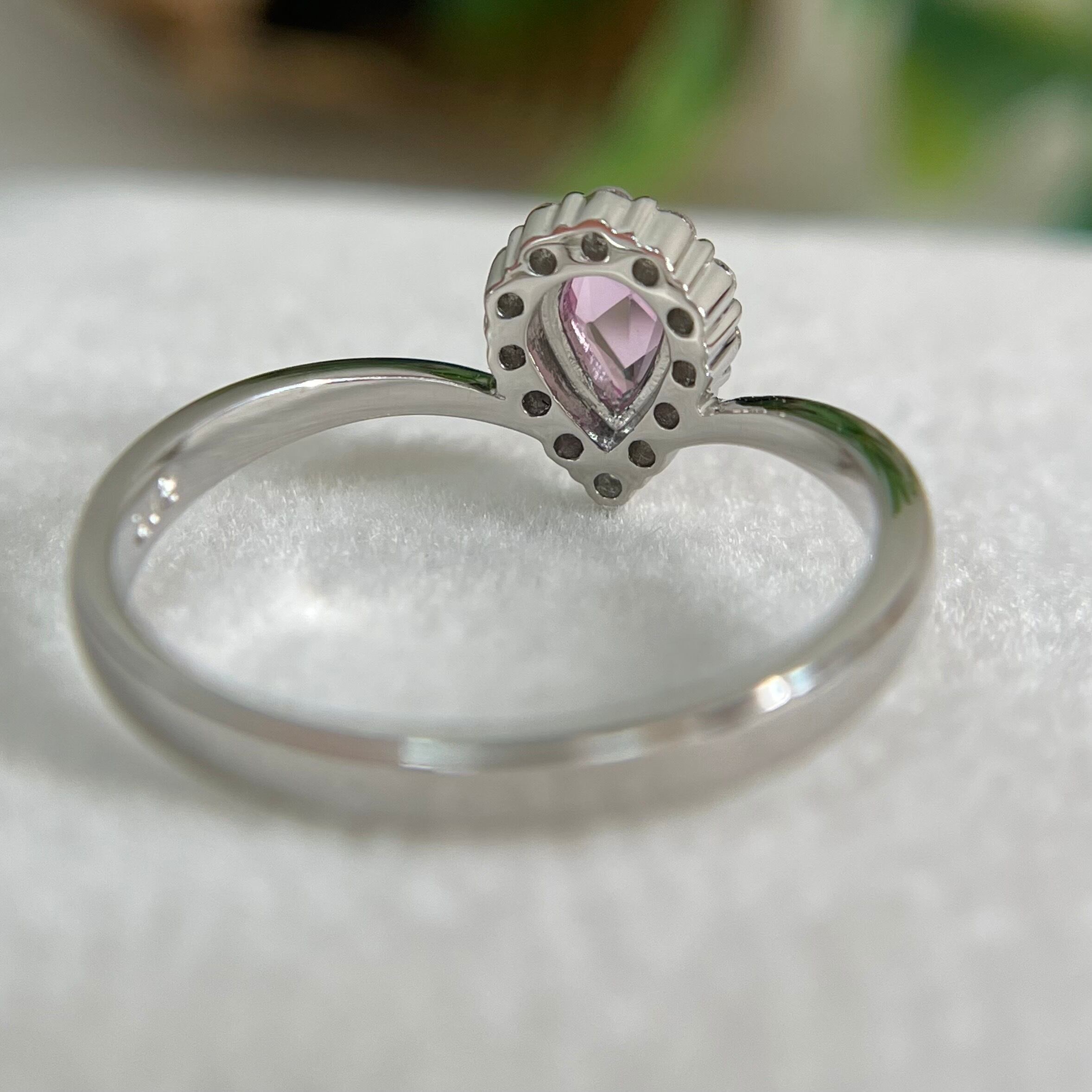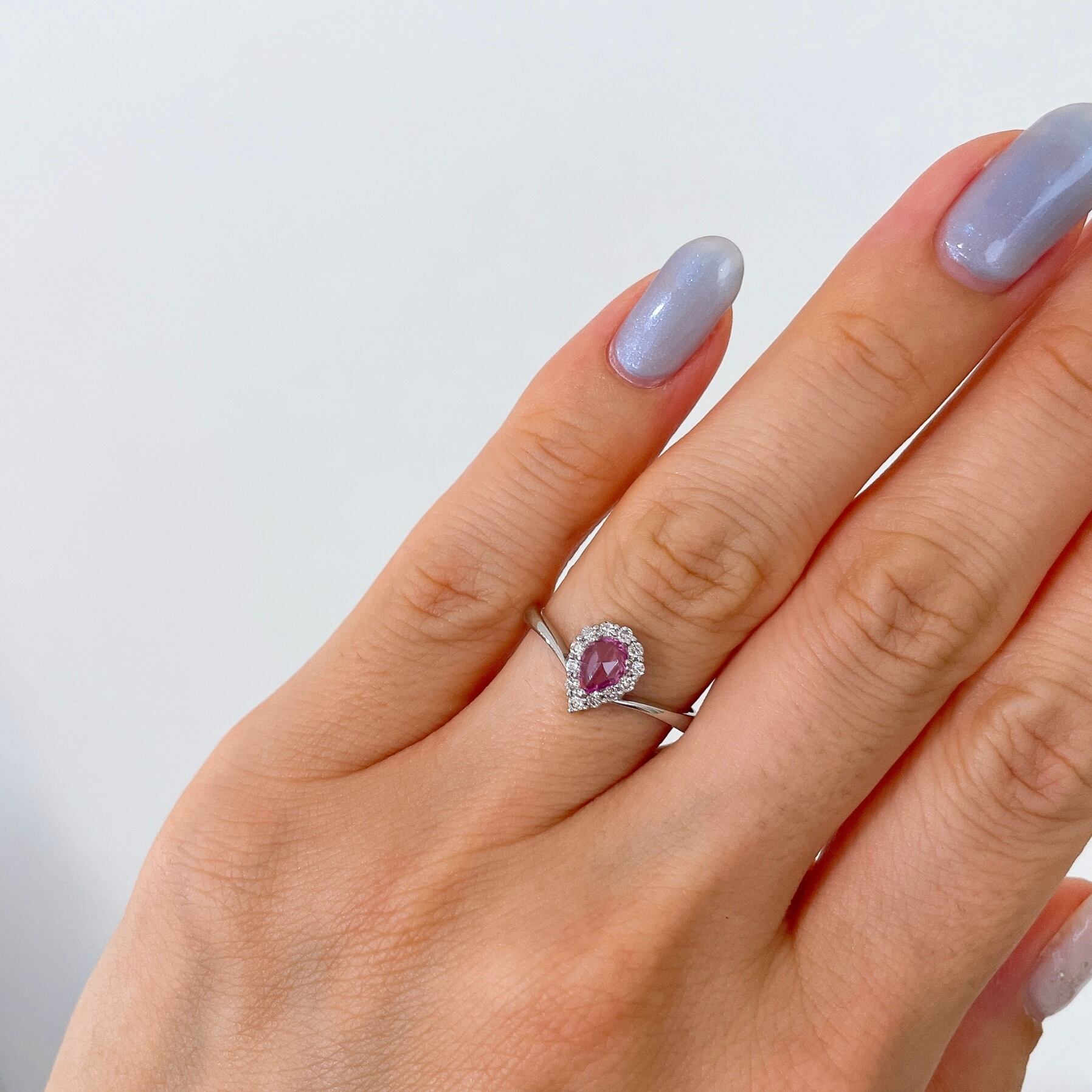 うるうると優しい光を放つパパラチアサファイア。ペアシェイプカットであることもより柔らかな印象を与えてくれます。
