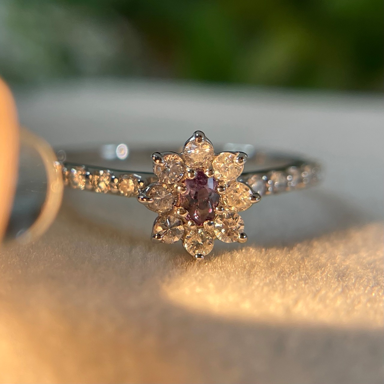 放射状にダイヤモンドが広がるような取巻きデザイン。センターに高さが出る取巻きとはまた違った雰囲気でアレキサンドライトが引き立ちます!
