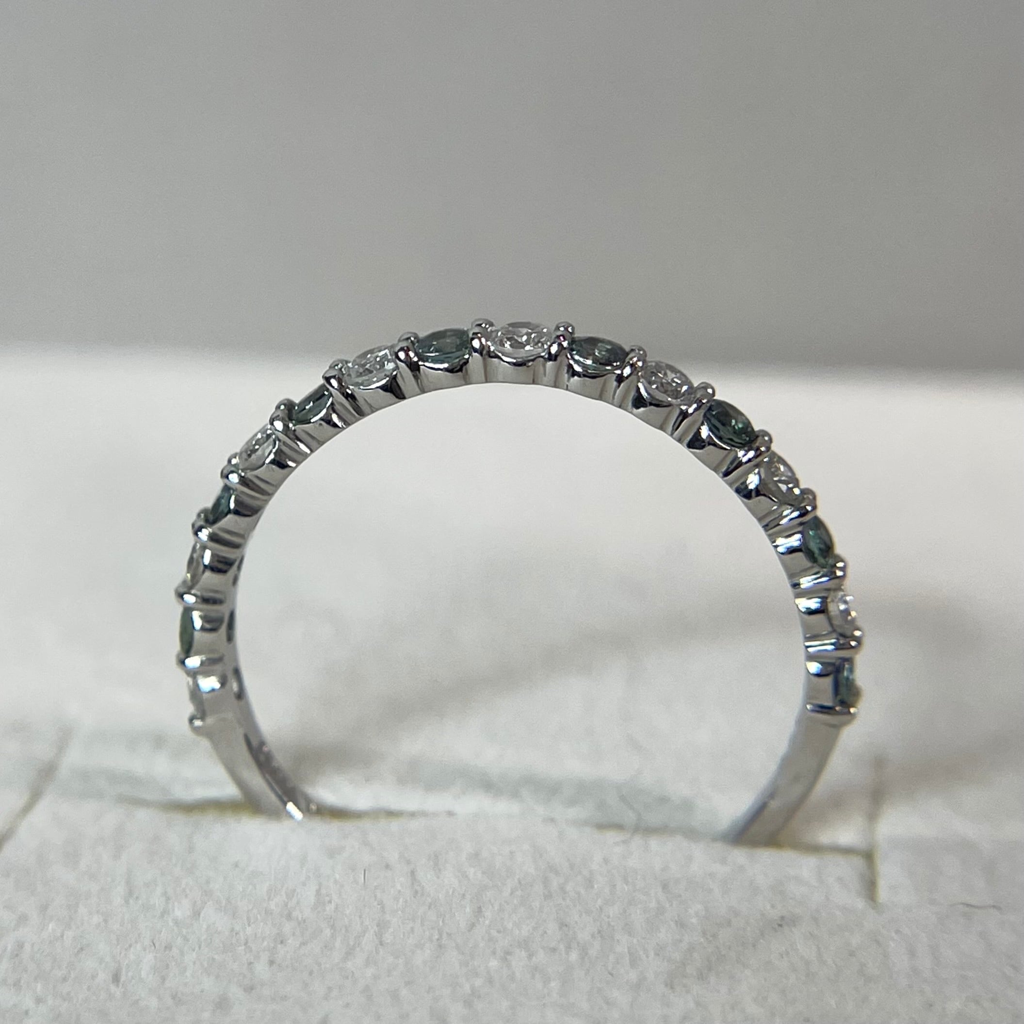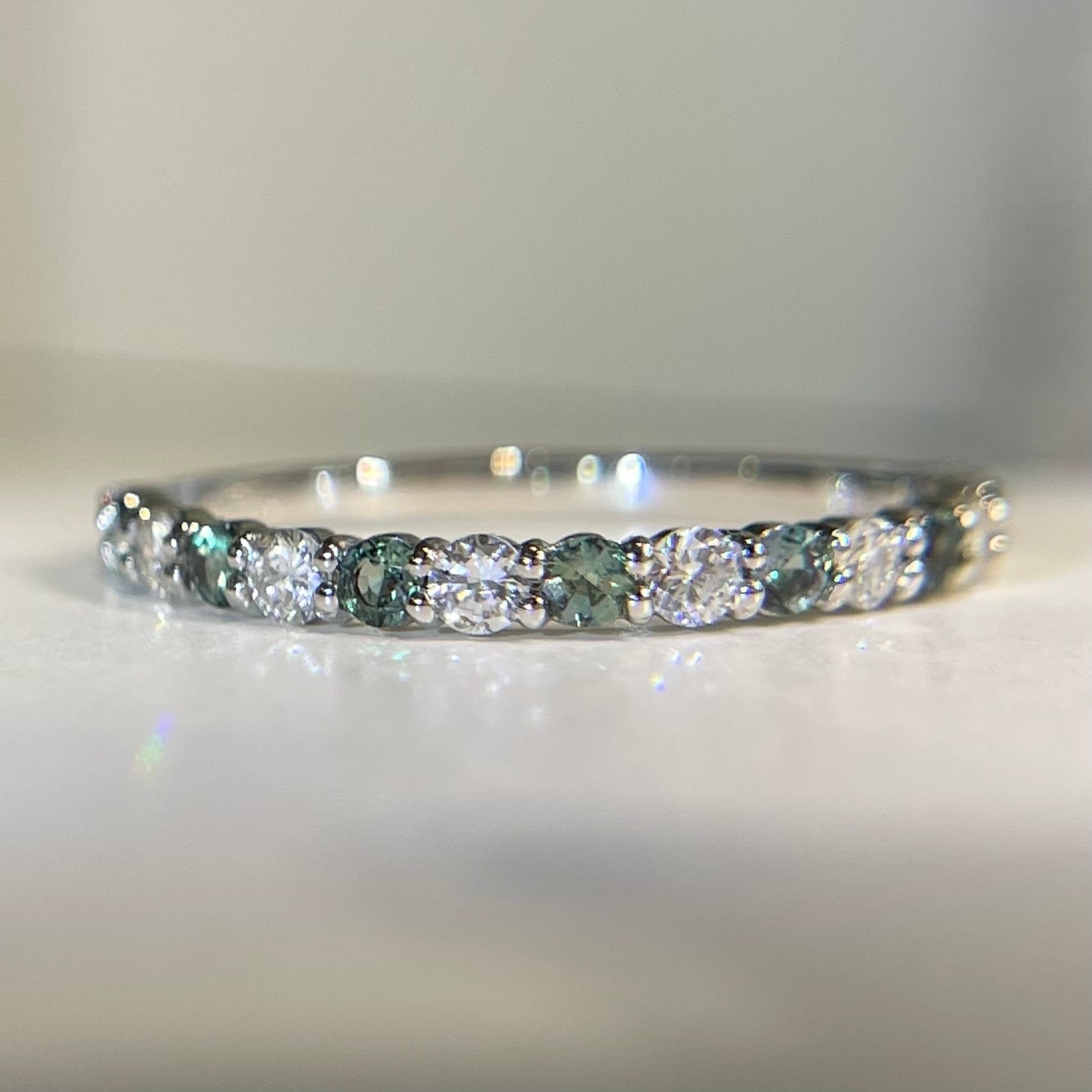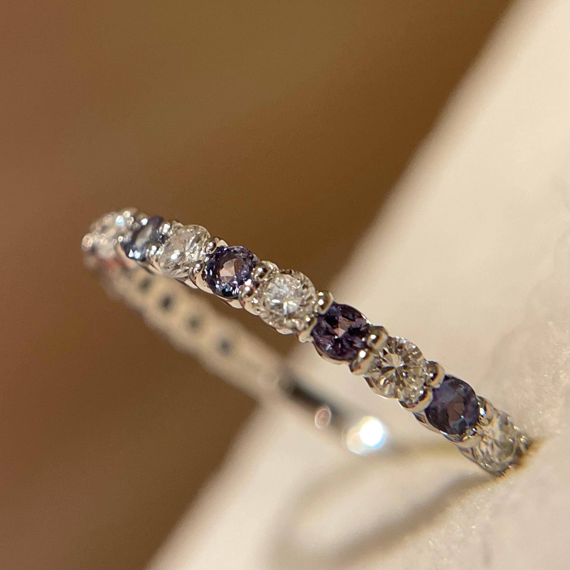 ラウンドのアレキサンドライト8ピースとダイヤモンド8ピースを交互にセッティングしたハーフエタニティリング。
