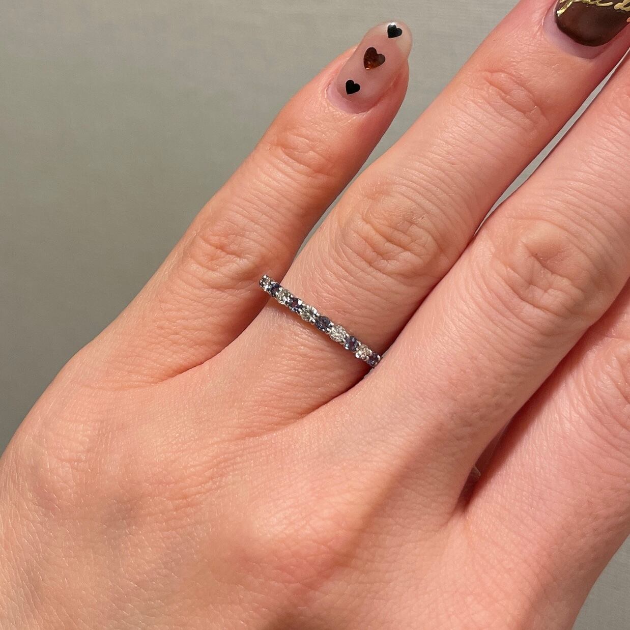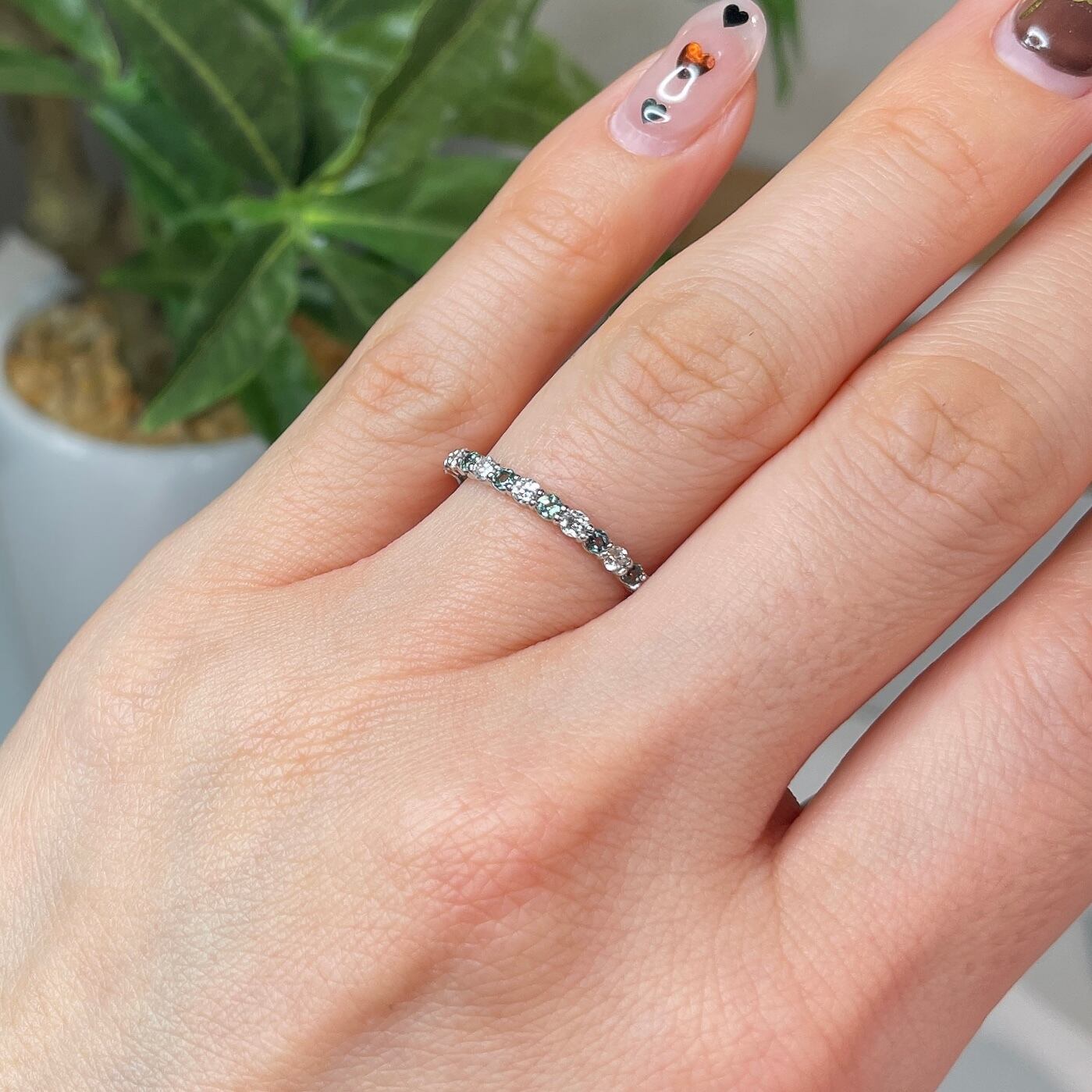 室内のライトでもカラーチェンジがお楽しみいただけ、透明度の高いダイヤモンドがキラキラ輝く、細身で重ね付けにも活躍するアイテムです。