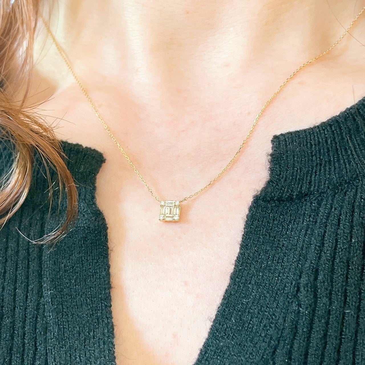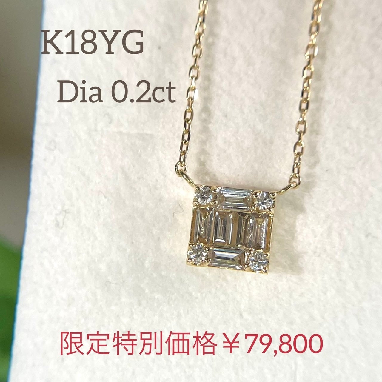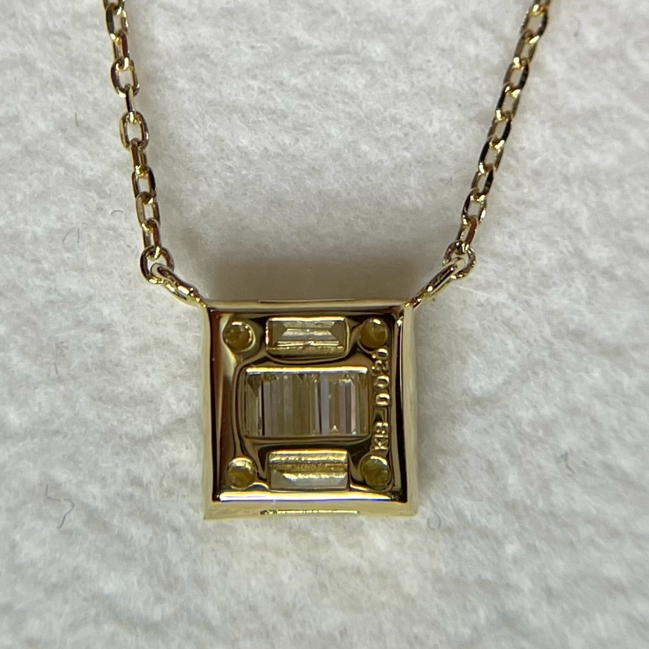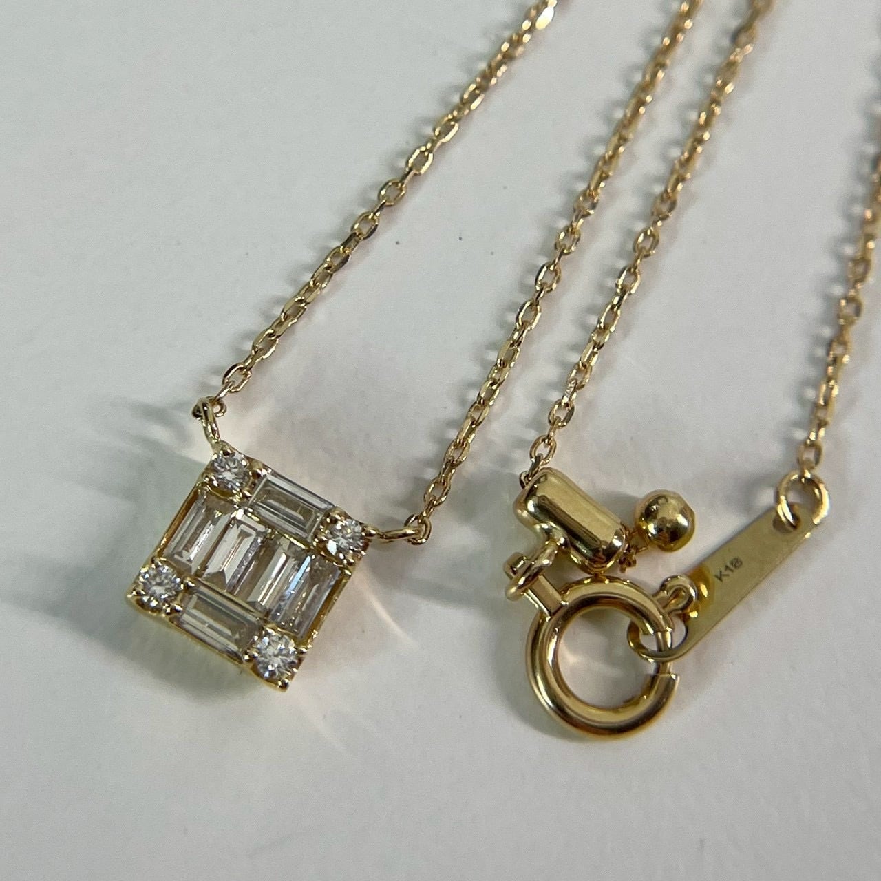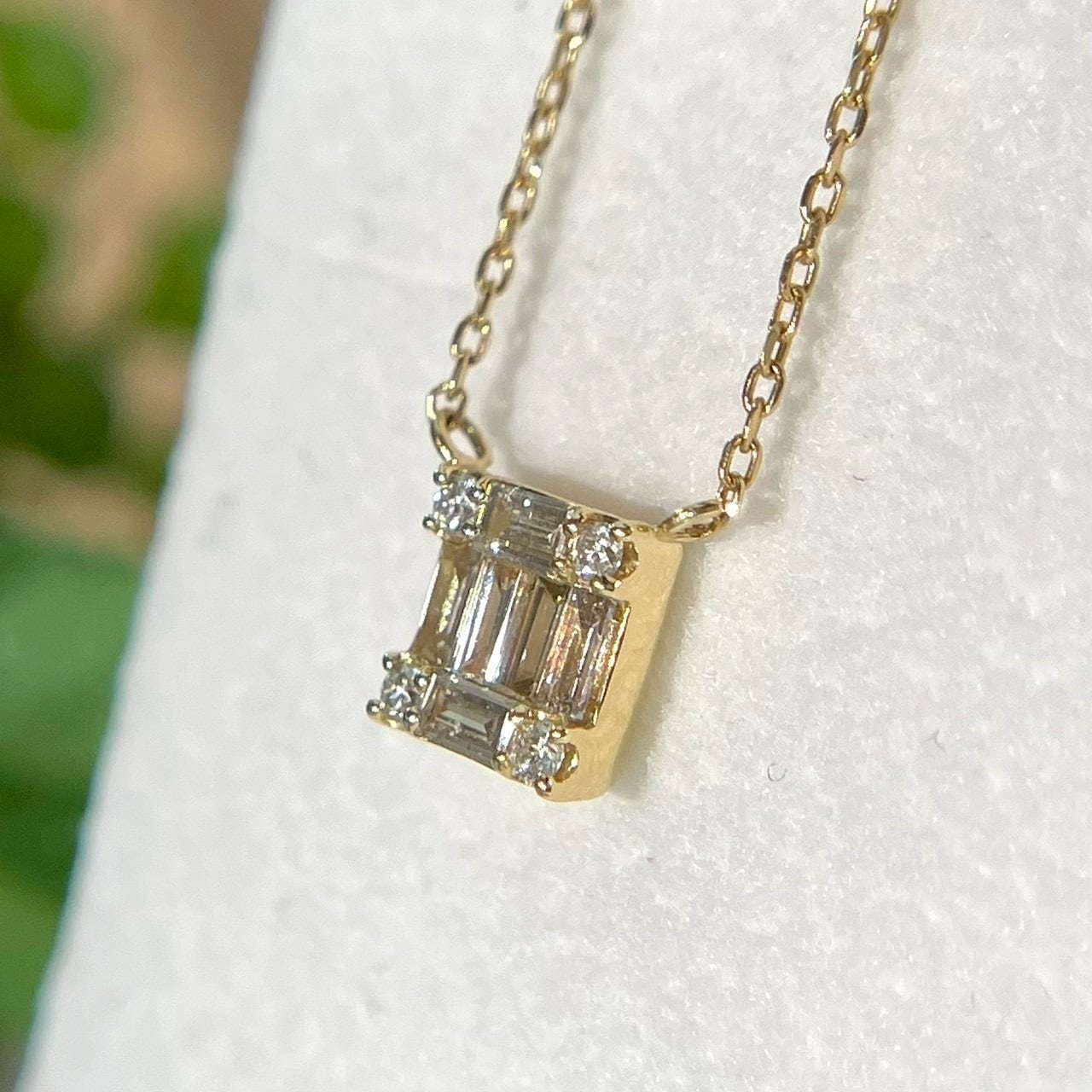四隅にラウンドのダイヤも配置し、シンプルながらオシャレなネックレスです。