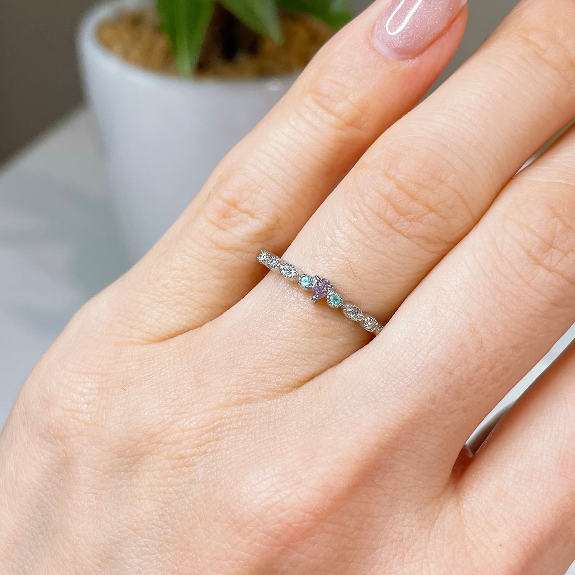 スッキリした色合いのファンシーパープルピンク、サイドにパライバトルマリンが配されています。