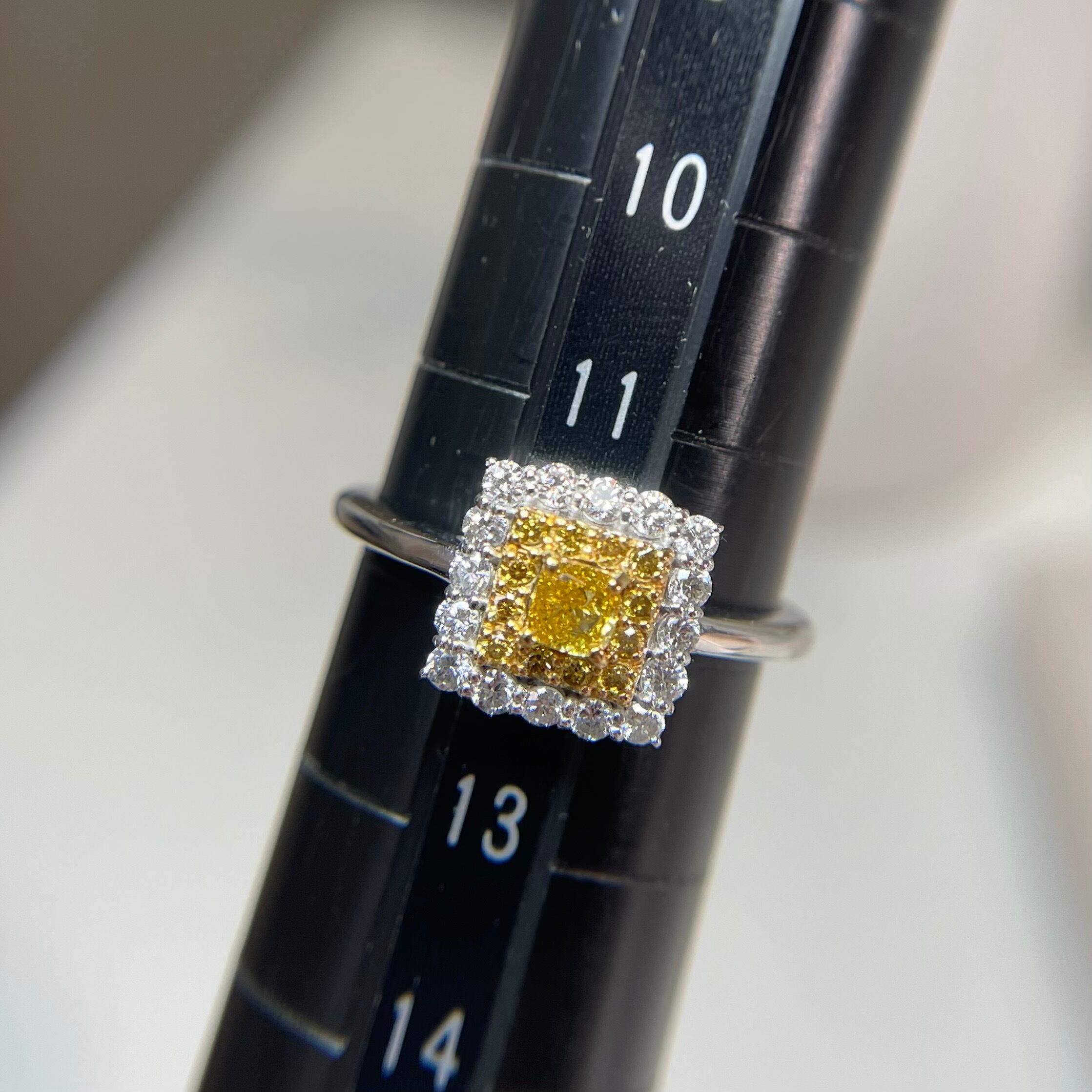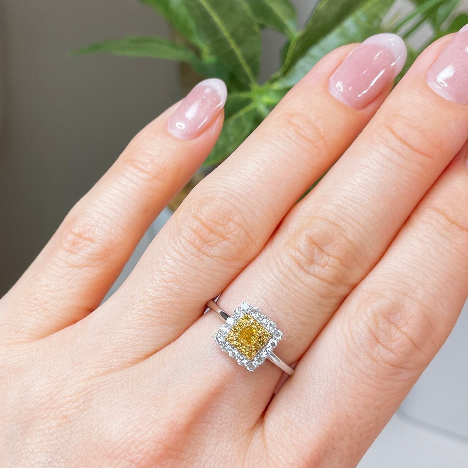 オレンジを含むイエローダイヤモンドは鮮明に色彩を放ち、取巻くイエローダイヤモンド、カラーレスダイヤモンドもとても綺麗で手元が華やぎます。