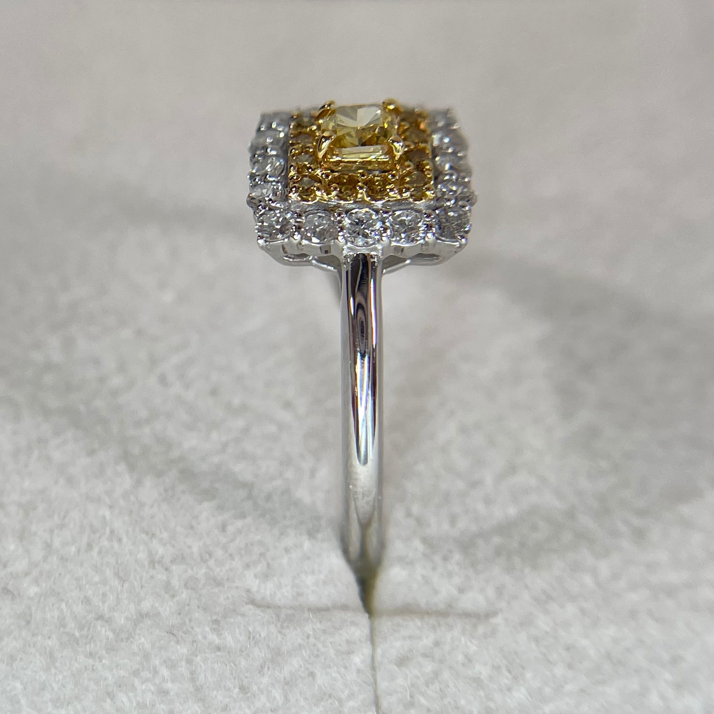 鮮やかさナンバーワンのファンシーヴィヴィッドクラスのダイヤモンドが目を引くリング