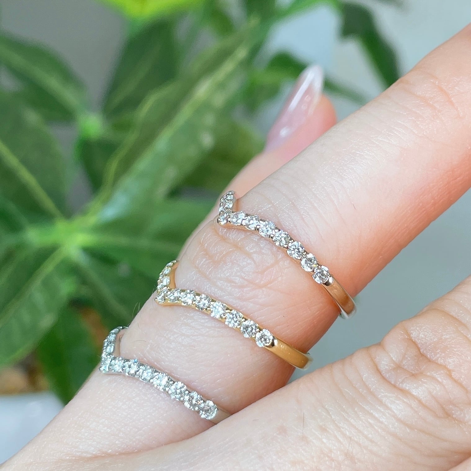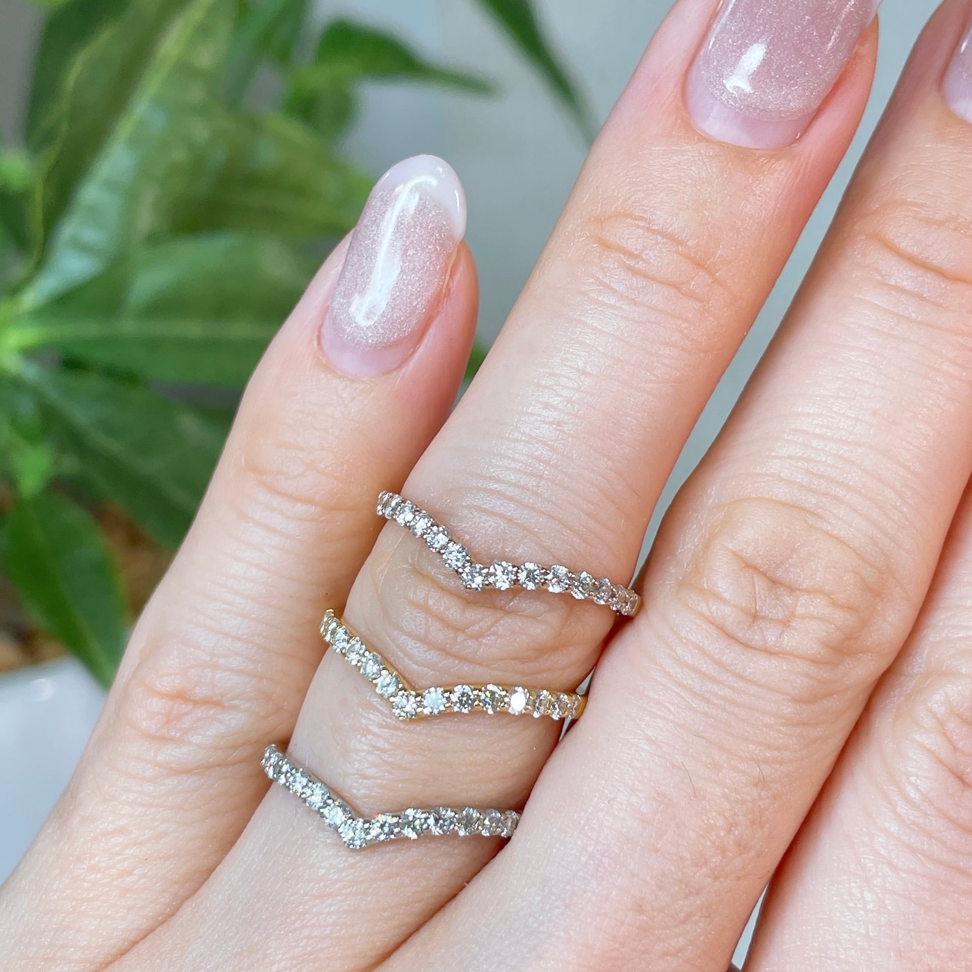 1本でももちろん、絶妙なVラインが重ね付けにもピッタリでお手持ちのリングとのコーディネートが楽しくなるアイテムです。