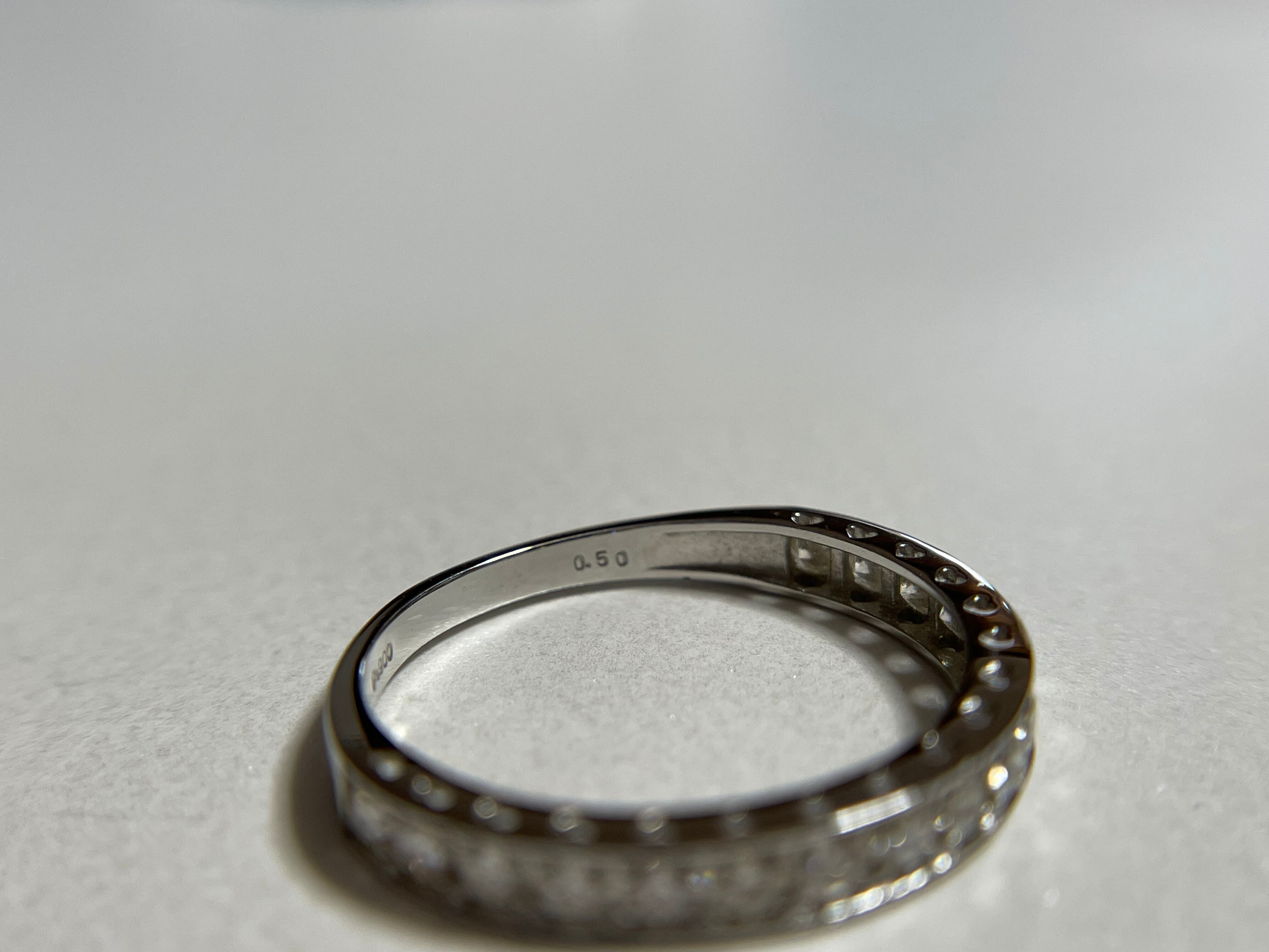手の甲の面には17ピースものダイヤモンドがぐるりとレール留でセッティングされ、手の内側はプラチナの地金なので引っかかりの心配もなく日常使いに適しています。