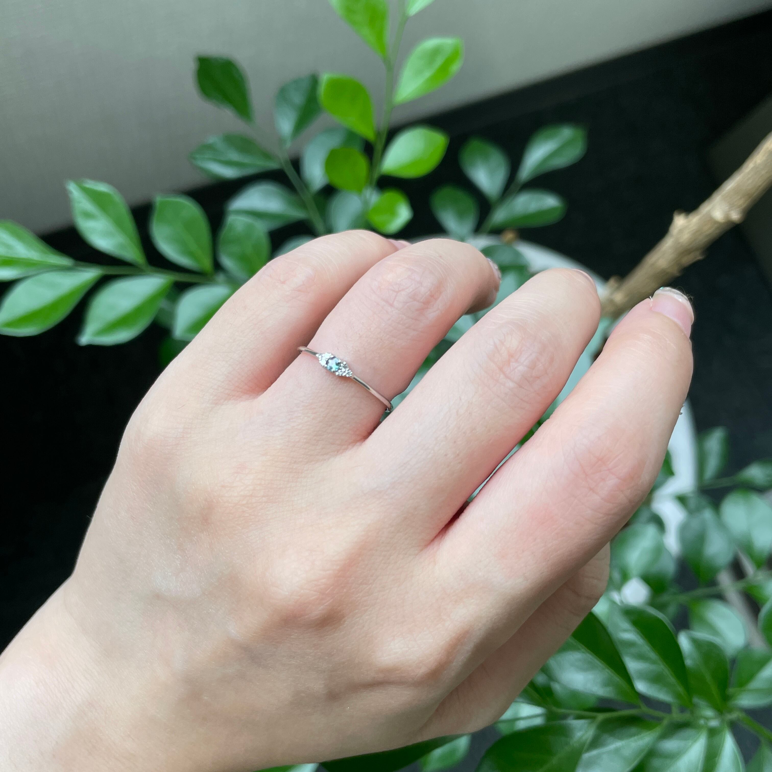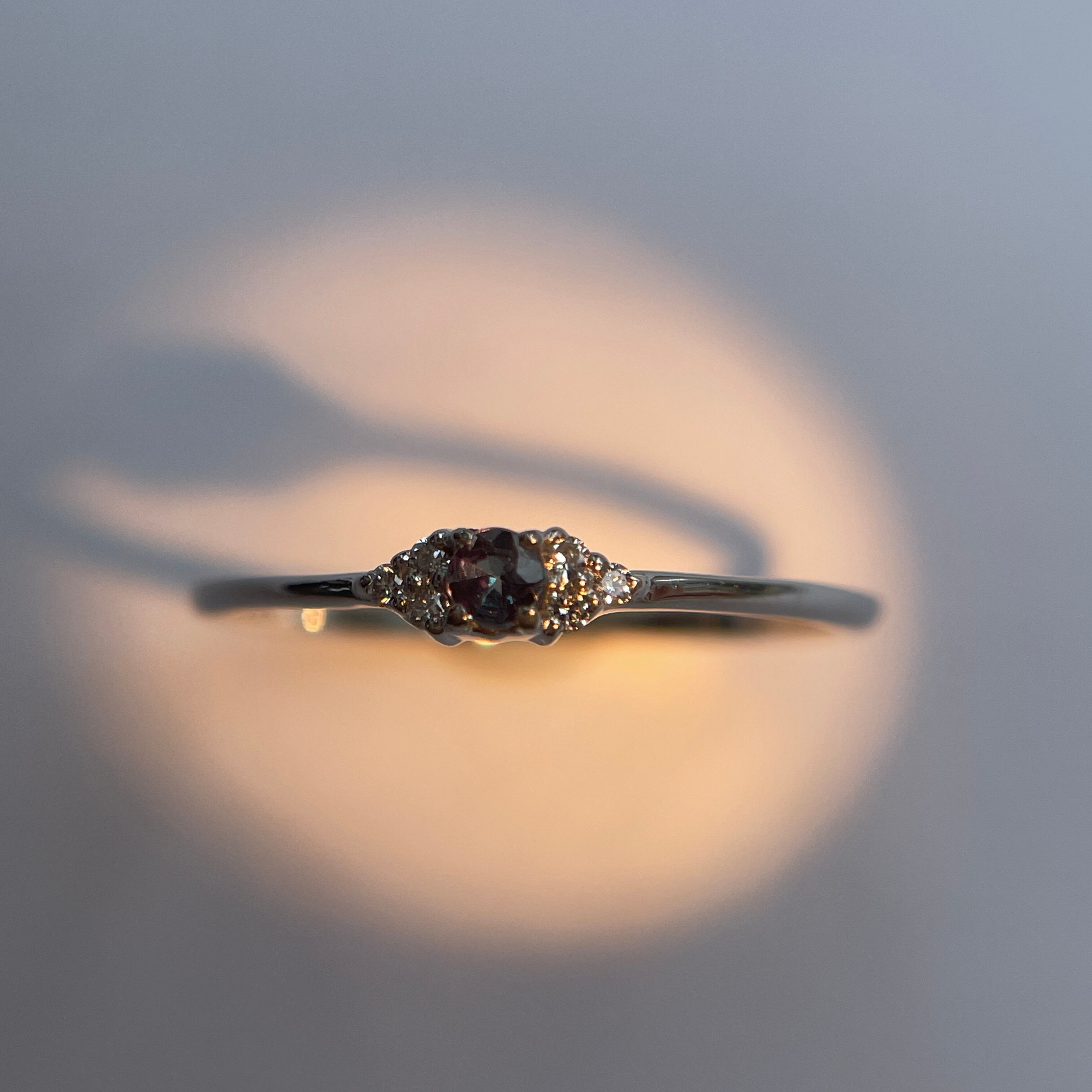 センターのアレキサンドライトとサイドのダイヤモンドが煌めく、シンプルで使いやすいリングです。
