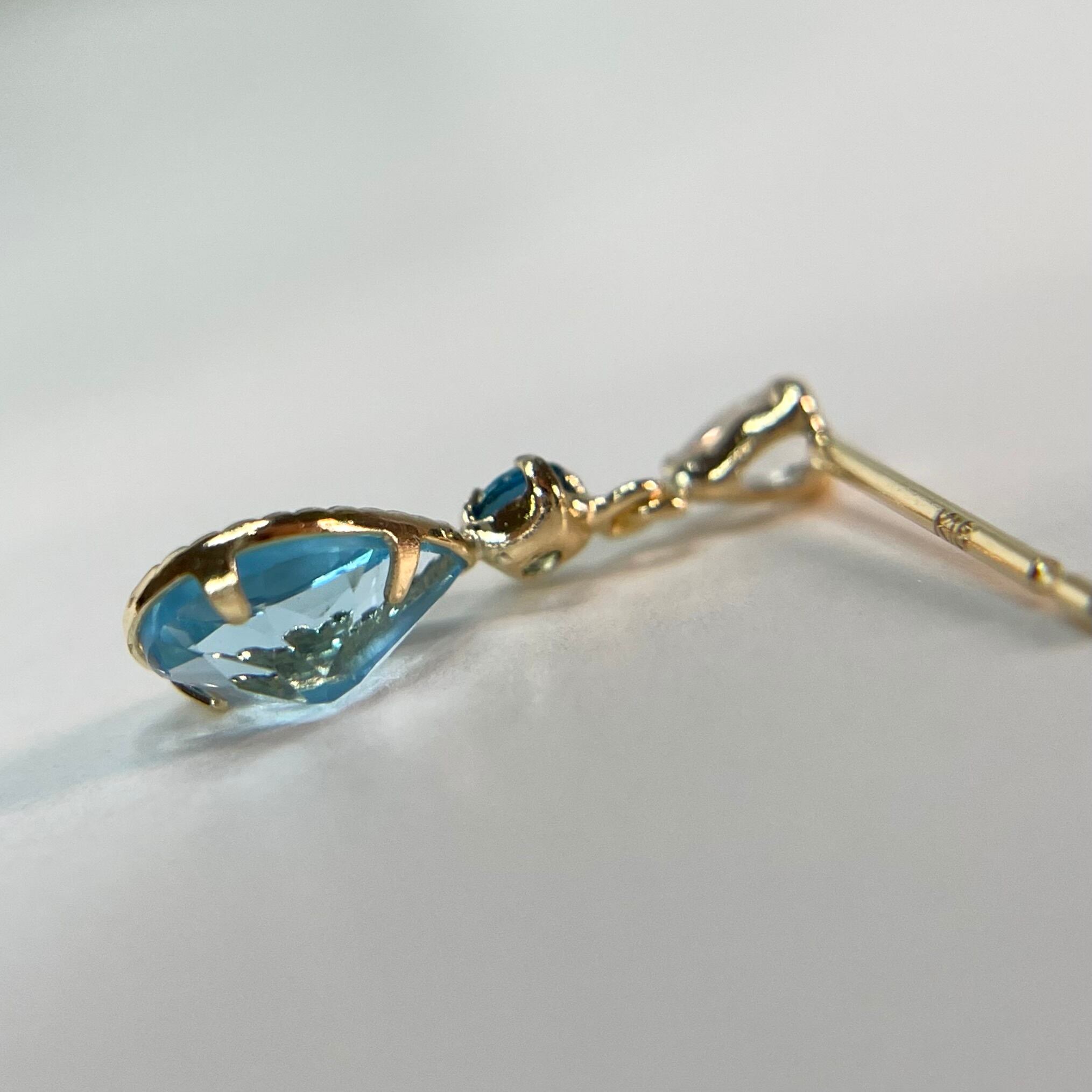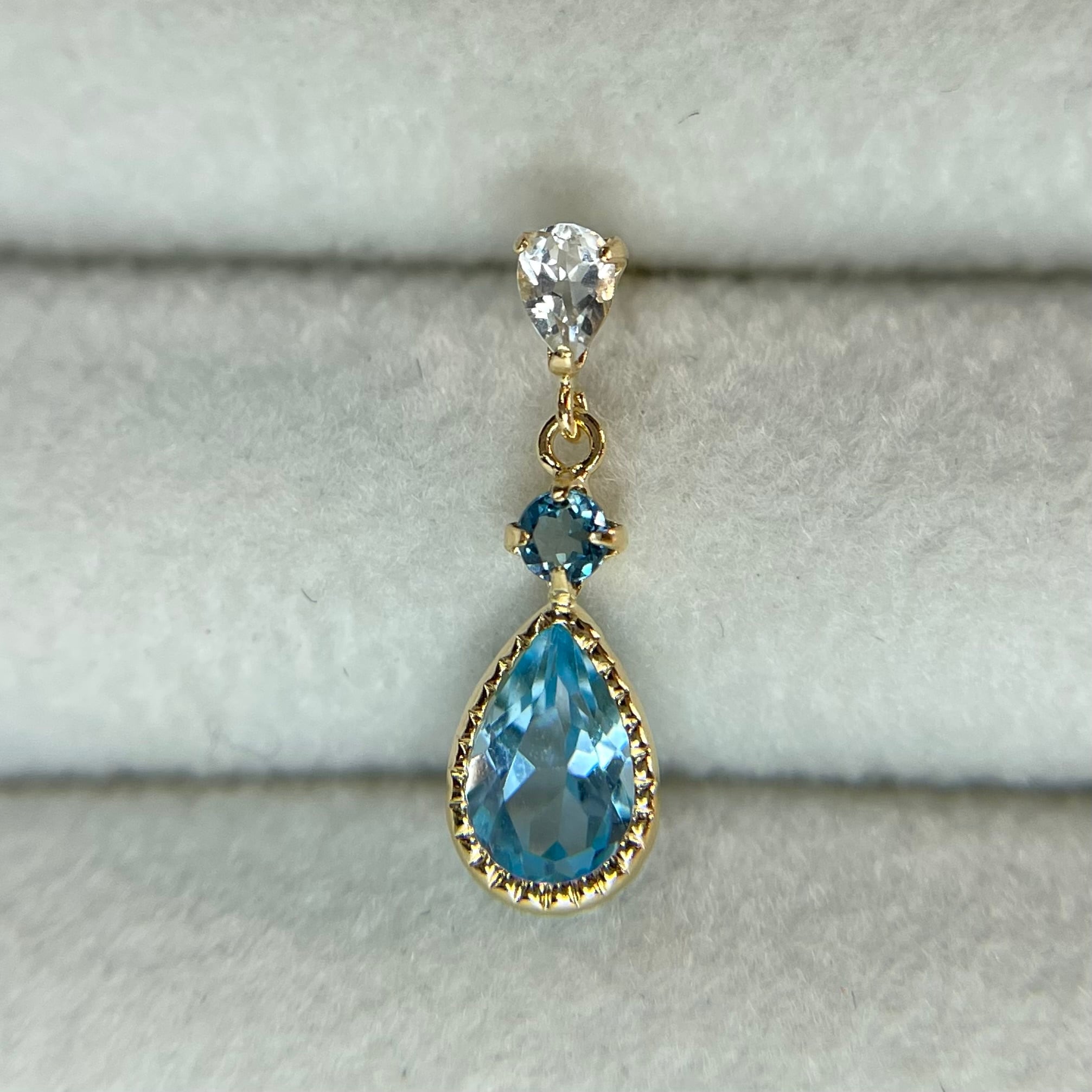 1番上にはペアシェイプのホワイトトパーズ、真ん中には濃い色合いのロンドンブルートパーズ、そして下で揺らめくブルートパーズと3色のトパーズを配したピアス。